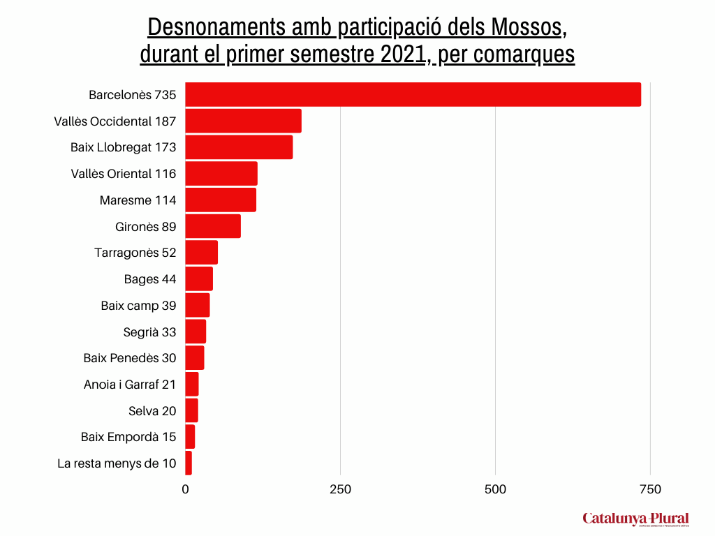 Durant el primer semestre d’aquest any, a Catalunya s’han produït 5061 desnonaments. Sumant la presència de la BRIMO, de l’ARRO i d’agents al marge de les unitats antidisturbis, els Mossos han intervingut a 1.744 desnonaments durant aquest període. Si comparem aquesta data amb les 8.690 intervencions, segons el Departament d’Interior, produïdes entre gener del 2017 i l’abril del 2021, podem veure que la presencia policial als desnonaments no s’ha reduït.