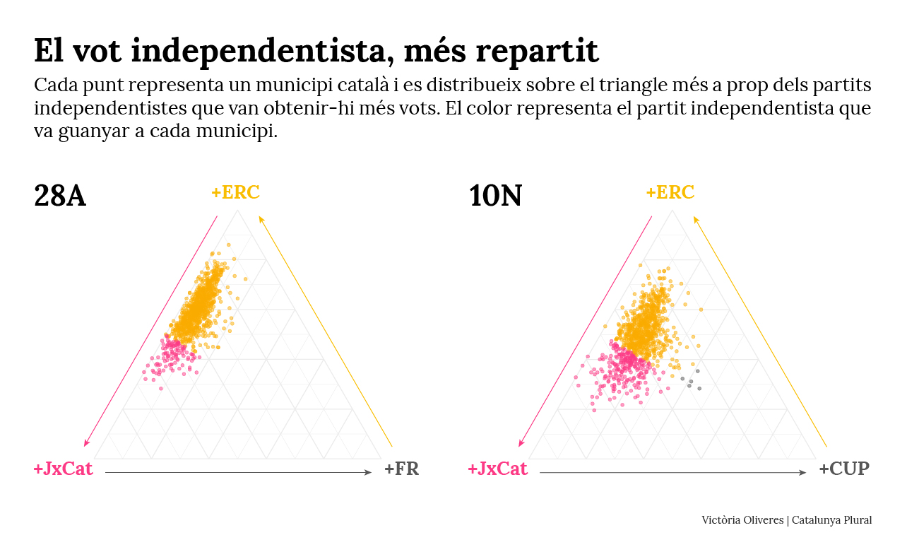 En el gràfic superior es pot veure de manera visual aquesta divisió. Els punts que s’ancoren cap als vèrtexs i els costats del triangle són aquells municipis on el vot es va decantar més cap a un o dos partits independentistes. En el gràfic del 28A es veu un posicionament clar del vot cap a ERC. Els punts que es distribueixen més cap al centre del triangle, en canvi, són aquells municipis on el vot independentista no es decanta clarament cap a cap dels tres partits, sinó que es reparteix de manera més equilibrada. Això ha passat amb major mesura en les eleccions d’aquest 10N.