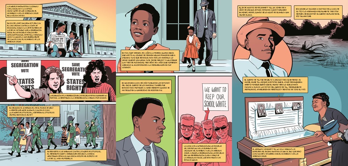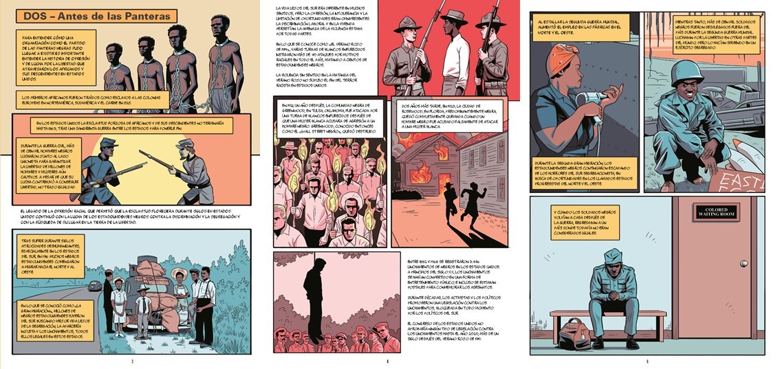 El partido de las panteras negras. Una historia gráfica rastrea el contexto histórico de la filosofía política que germinó en la creación del partido, contextualizando la opresión y la violencia racista sistémica y la brutalidad policial, especialmente en la conocida como la era de “Las Leyes Jim Crow”, que propugnaban la segregación racial en todas las instalaciones públicas. La segregación, de facto, fomentaba la desigualdad económica y social en todos los sentidos, evidente en el desempleo y en la segregación forzada de las viviendas. También en la justicia y en la educación. Conocido es el caso de Ruby Bridges, de 6 años, que en 1960 tuvo que asistir a diario al colegio de primaria escoltada por los Marshals, por ejemplo.