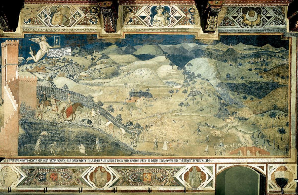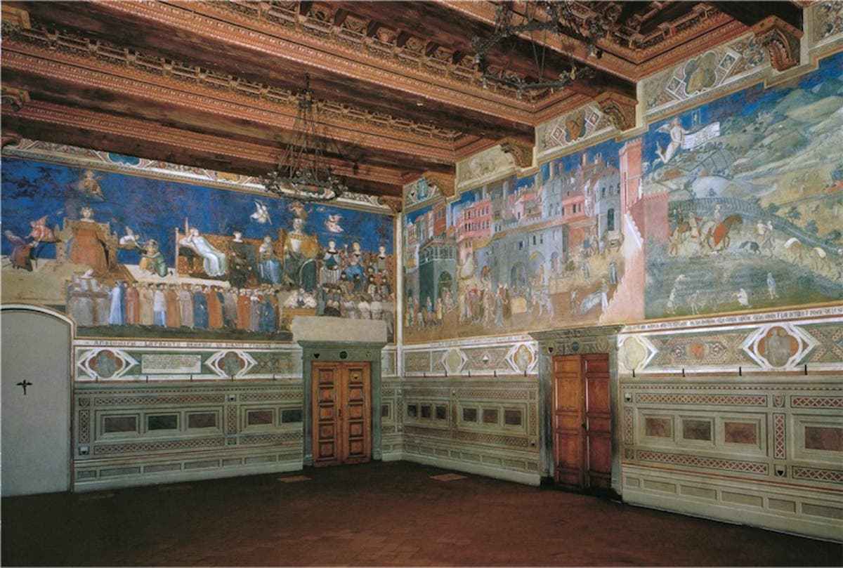 Los frescos del bien común, o del buen y el mal gobierno, cubren los muros de la Sala dei Nove, donde se reunían los miembros del gobierno de la República de Siena y fueron realizados, en estilo gótico, en el momento de máximo apogeo de riqueza y poder de la Ciudad. Este gobierno encarga a los hermanos Lorenzetti la creación de un programa iconográfico que mostrara a los ciudadanos que la República era la mejor manera de organizar el poder, al tiempo que recordara a los gobernantes cuáles eran los ideales a seguir: que el bien común estuviera por encima de su interés particular.