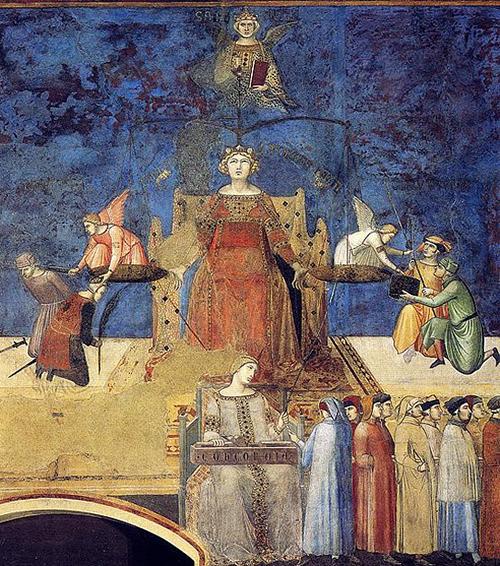 Entrando más en detalle en la obra, en la Alegoría del bien común tenemos dos figuras que destacan por encima de las otras. La perspectiva medieval jerárquica nos dice que las figuras más grandes son las figuras más importantes del conjunto y, por tanto, aquellas que deben centrarse primeramente nuestro interés. Iniciamos la lectura por la figura vestida de rojo situada a la izquierda, que representa la alegoría de la santa virtud de la Justicia, nos aparece como una matrona coronada y entronizada acompañada de varias figuras: una figura alada, la Sabiduría de dios que lleva en las manos la balanza de la justicia, simbolizando las dos tipologías de justicia que tenemos: la distributiva, representada con un ángel rojo (la que castiga y premia) y la justicia conmutativa, con un ángel vestido de blanco, que está ofreciendo a dos hombres las unidades de medida y las reglas a quien se dedicará la banca y la empresa.