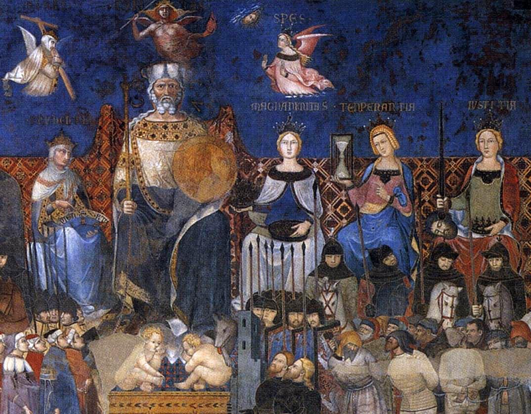 Encima de la cabeza, el bien común encuentra lasb, vinculadas a la tradición católica: la fe, la esperanza y la caridad. A derecha e izquierda del bien común encontramos las seis virtudes cívicas o cardinales. Las cuatro virtudes cardinales: la prudencia, justicia, templanza y fortaleza cada una con sus atributos. En este caso, el pintor, Ambroggio, añade dos virtudes más: la magnanimidad, – porque para querer el bien común debes disponer de una gran alma – (lo que hoy llamaríamos tener buen fondo, buen corazón o buenas intenciones), y saber dejar de lado los intereses personales. La sexta virtud cívica que acompaña el bien común es la Paz, representada con una bellísima mujer vestida de blanco tumbada sobre unas armas, con una rama de olivo y una corona de laurel situada de manera brillante en el punto medio entre la justicia y el bien común.
