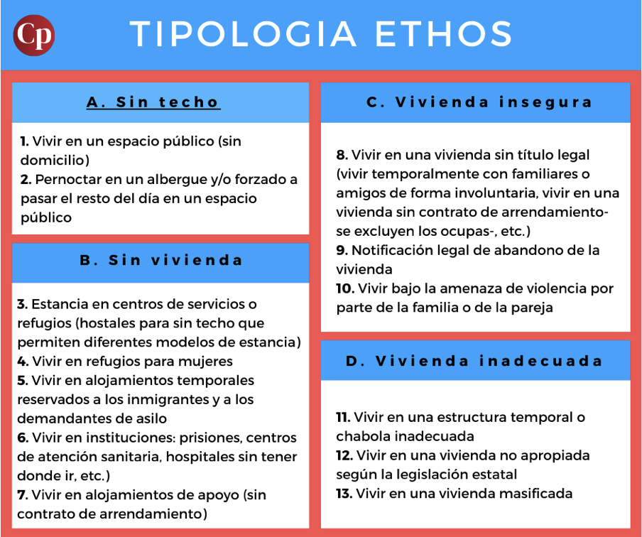 Ante las diferentes definiciones y conceptos, FEANTSA ha elaborado una tipología europea de definición de situaciones de sinhogarismo. Se conocen como las tipologías ETHOS (European Typology of Homelessness and Housing Exclusion) y el objetivo es cubrir todas las situaciones y variantes derivadas de la exclusión residencial. Estas categorías se dividen en: personas sin techo, personas sin hogar. personas que viven en una vivienda insegura y personas que viven en una vivienda inadecuada. Con sus subdivisiones, abarcan un total de 13 categorías. En palabras de Juan Carlos Viniegra, Coordinador general del programa de Homeless Entrepreneur, alcanzar cualquier de los 13 niveles de Sinhogarismo crea un deterioro en la persona que afecta a las relaciones familiares y sociales, llevando a un desarraigo cuyas consecuencias en la mayoría de los casos conducen a situaciones de desunión, conflicto y finalmente en el desarrollo de desequilibrios y/o enfermedades mentales.