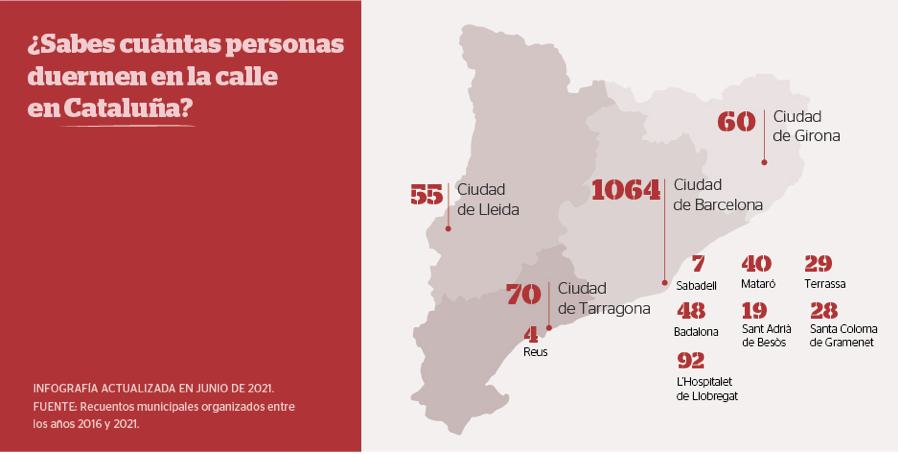 En Cataluña no hay datos actualizados que permitan saber cuántas personas duermen en la calle. Lo que sí sabemos es, como indica la infografía publicada por la Fundació Arrels gracias a los recuentos de los municipios reflejados, que 1.516 personas duermen en la calle en 12 municipios. En total, estos 12 municipios acogen el 44% de la población catalana.